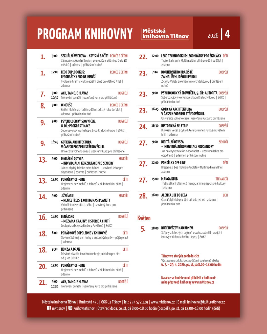 Milé čtenářky a čtenáři, 🌷 duben v naší knihovně bude opravdu pestrý. 📚✨ Podrobnosti najdete v přiloženém programu. Budeme rádi, když dorazíte. 💛 Těšíme se na vás! Vaše knihovna